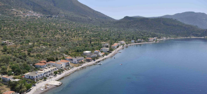 Η μεγάλου μήκους στενόμακρη παραλία βρίσκεται μπροστά στο δρόμο και στα σπίτια, έχει ηφαιστειογενή μεγάλα βότσαλα και είναι πολύ ήσυχη.
